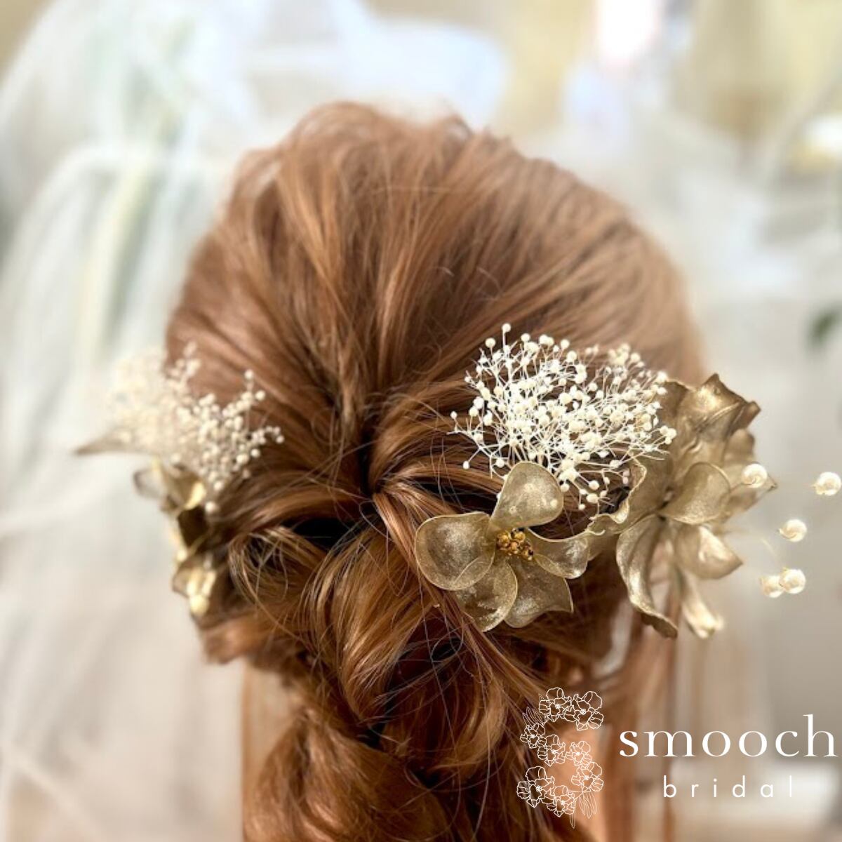 かすみ草のボリューム感が、どの角度から見ても引き立つ華やかなヘアスタイルを演出します。