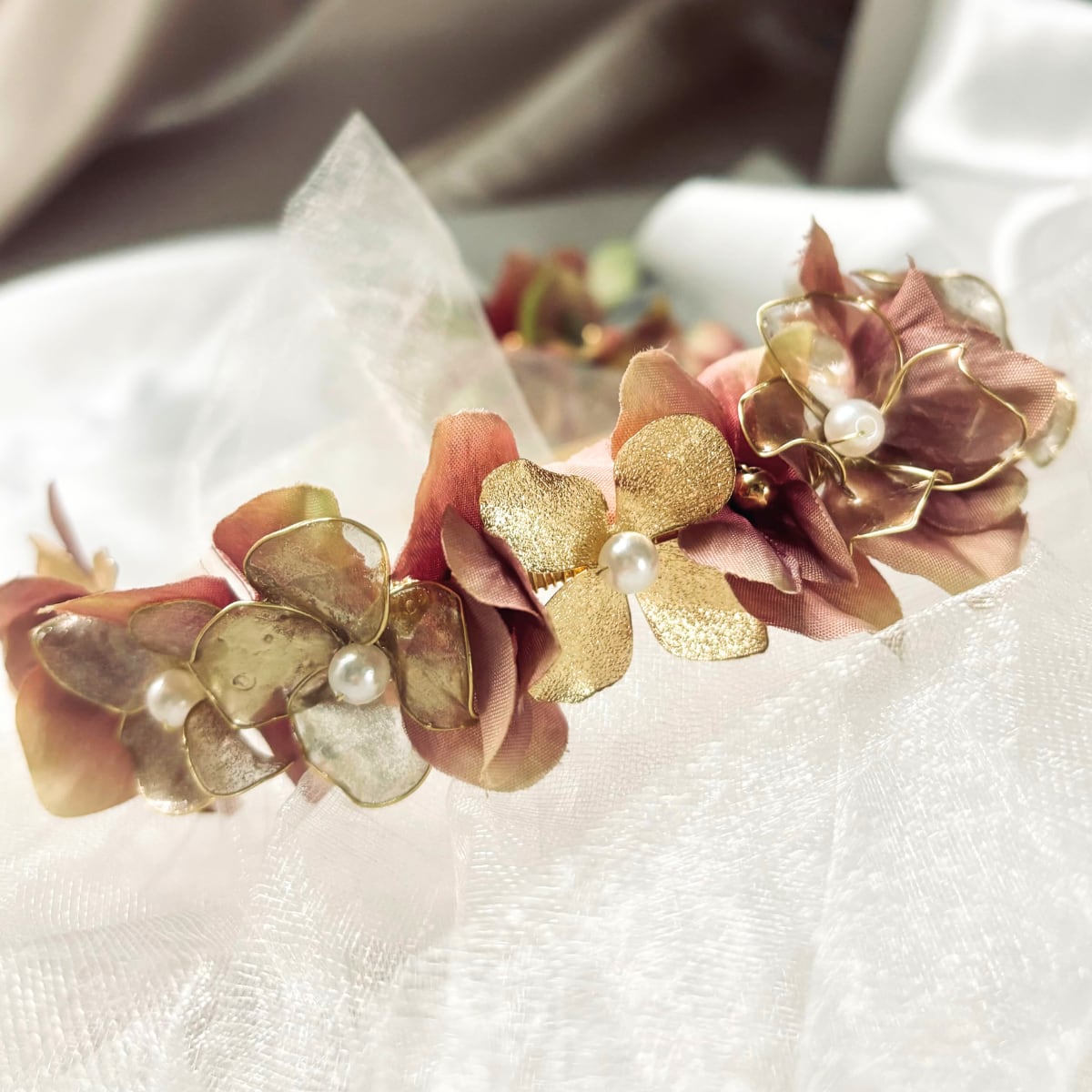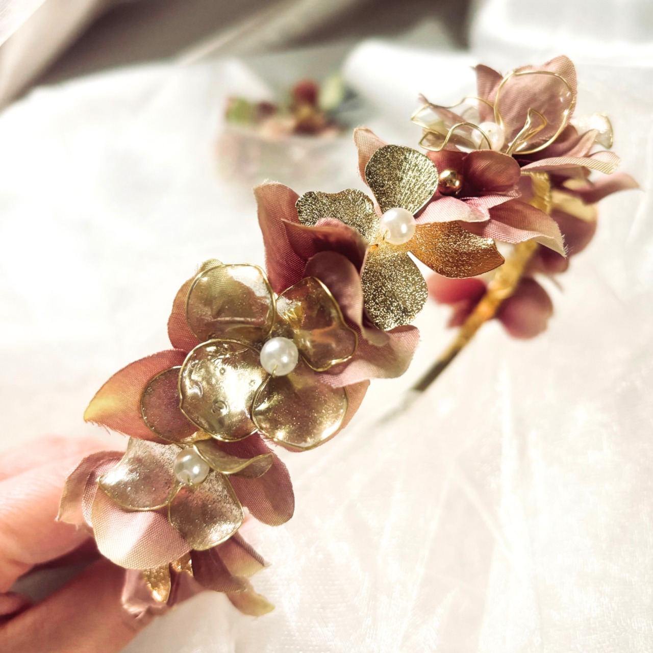 スモーキーピンクの花が施されたこのカチューシャは、流行のカラードレスにぴったりなデザインが特長です。